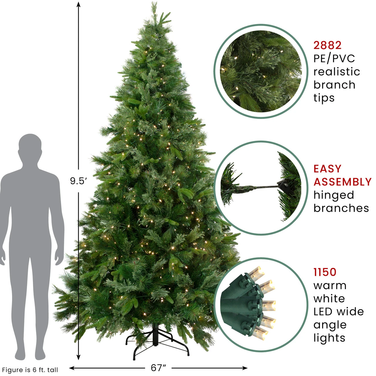 Dimensions: 9.5′ high (from the base of stand to the top of the tree)