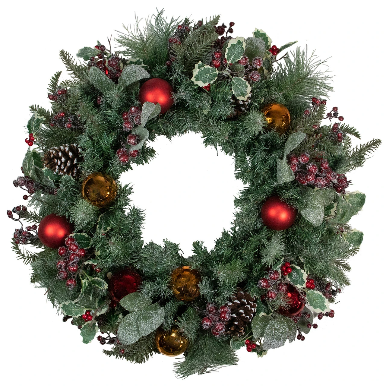 Accented with mixed foliage, iced berries, pine cones and ball ornaments
