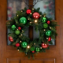 Pre-Lit Red And Green Artificial Classic Christmas Wreath, 24-Inch, Clear LED Lights