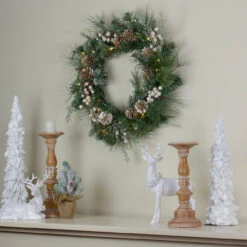 Pre-Lit Champagne Gold Pine Cone And Berry Mixed Pine Wreath – 22-Inch, Clear Lights