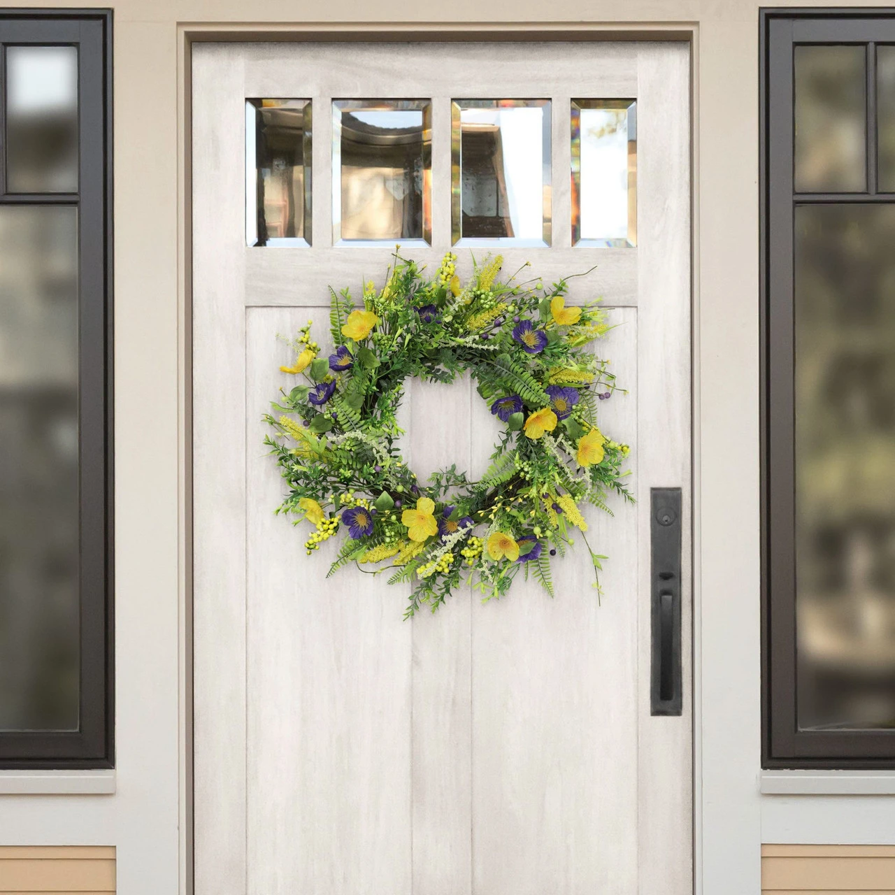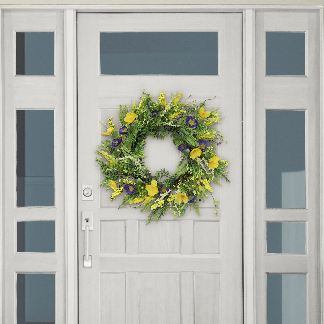 Features a lavender and yellow flowers accented mixed spring wreath